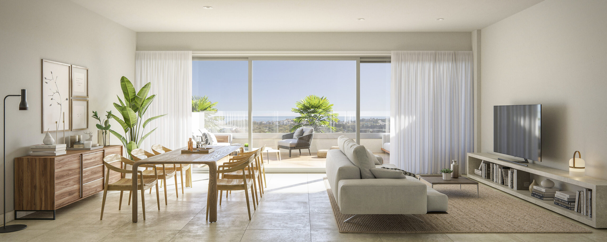 These contemporary properties feature sleek design, offering bright and airy interiors that give way to generous terraces. The floor to ceiling windows allow the sunlight to flood in. The equipped open concept kitchens flow effortlessly into the living and dining areas. The bedrooms come with fitted wardrobes, and the main bedroom includes an en-suite bathroom. Some features are porcelain or laminated floors and hot and cold AC.