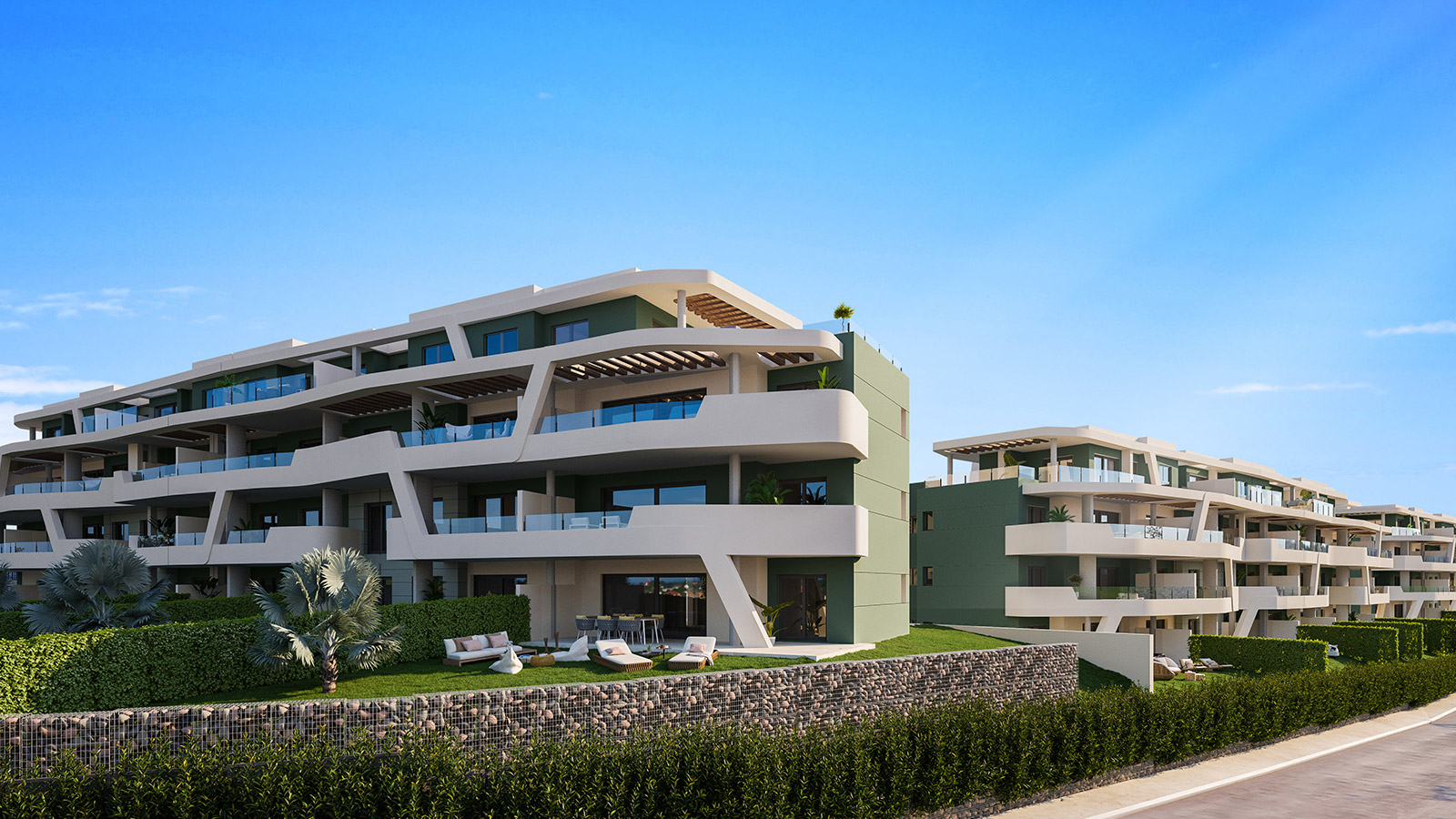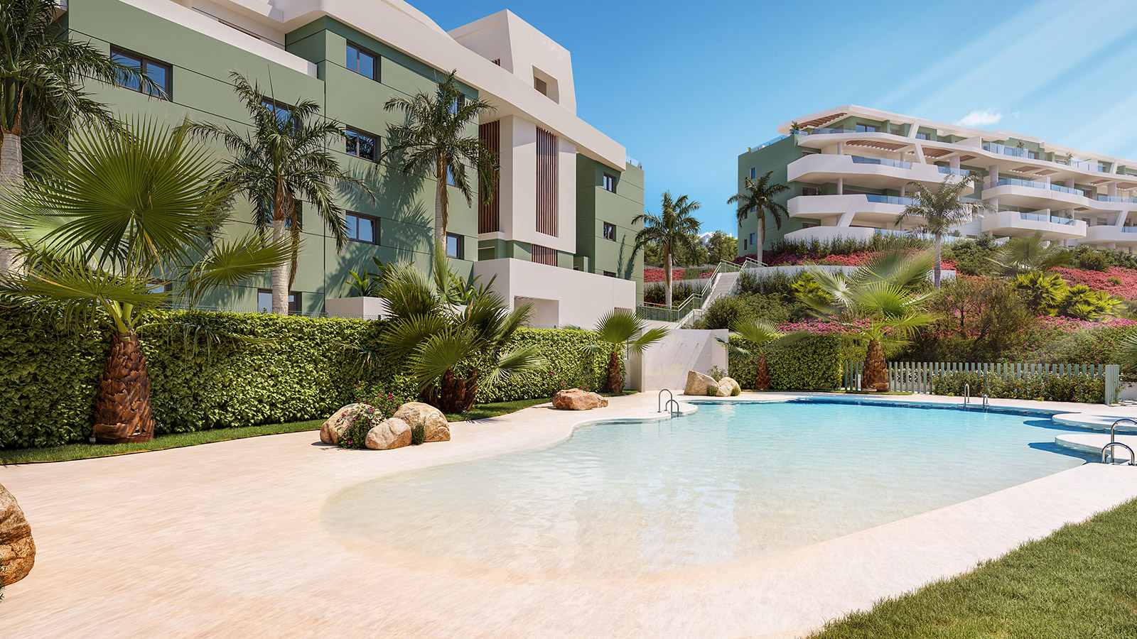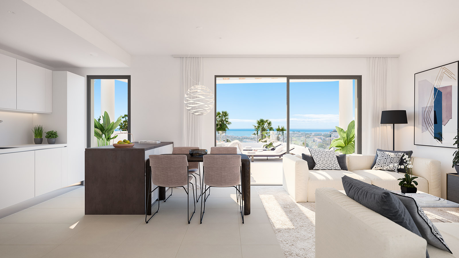 This spectacular residential development is located in La Cala de Mijas with two and three bedroom properties and penthouses. Its elevated location commands privileged views over the sea and Calanova golf course. A cutting-edge project in each element is an essential piece of the design philosophy. Design and detailing are impeccable, and interior space ranges from 87m2 to 115m2, with large panoramic terraces.